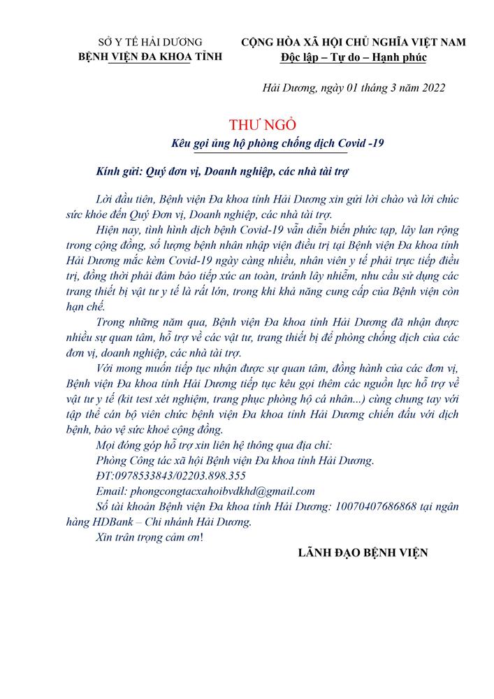 Với mong muốn tiếp tục nhận được sự quan tâm, đồng hành của các đơn vị, Bệnh viện Đa khoa tỉnh Hải Dương tiếp tục kêu gọi thêm các nguồn lực hỗ trợ về vật tư y tế (kit test xét nghiệm, trang phục phòng hộ cá nhân...) cùng chung tay với tập thể cán bộ viên chức bệnh viện Đa khoa tỉnh Hải Dương chiến đấu với dịch bệnh, bảo vệ sức khoẻ cộng đồng.