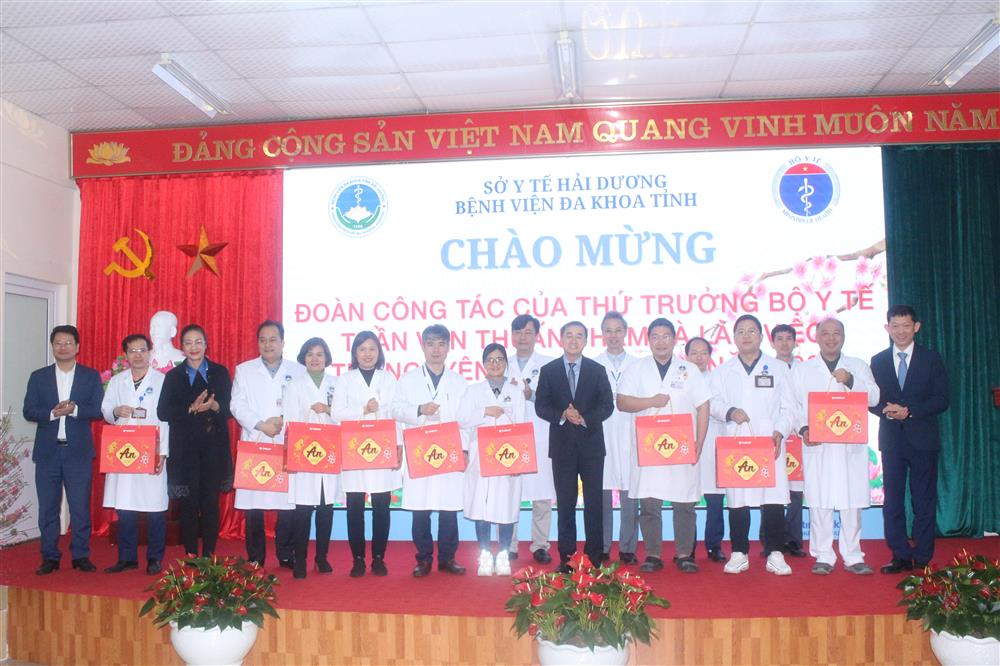 Thứ trưởng Trần Văn Thuấn tặng quà chúc Tết và chụp ảnh lưu niệm cùng Ban lãnh đạo Sở Y tế và Bệnh viện Đa khoa tỉnh Hải Dương