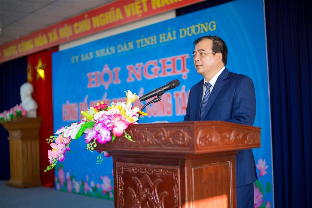 Đồng chí Phó Chủ tịch UBND tỉnh Hải Dương Nguyễn Minh Hùng phát biểu tại hội nghị công bố các quyết định của Chủ tịch UBND tỉnh về công tác nhân sự đối với Bệnh viện Đa khoa tỉnh
