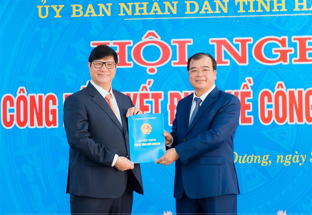 Đồng chí Phó Chủ tịch UBND tỉnh Hải Dương Nguyễn Minh Hùng (bên phải) trao quyết định của Chủ tịch UBND tỉnh về việc giao quyền Giám đốc Bệnh viện Đa khoa tỉnh Hải Dương cho TS.BS Vũ Minh Hiệp
