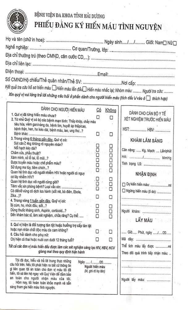 Mẫu đăng kí hiến máu tại Bệnh viện Đa khoa tỉnh Hải Dương