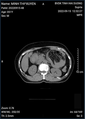 Chúng tôi xin báo cáo một trường hợp lâm sàng bệnh nhân nữ 51t vào viện vì đau dữ dội vùng thượng vị và hạ sườn trái ngày thứ nhất kèm theo có nôn buồn nôn. Bệnh nhân được khám tại bệnh viện huyện không đỡ chuyển lên bệnh viện tỉnh trong tình trạng đau và nôn liên tục. Khám lâm sàng bệnh nhân mạch huyết áp ổn định, bụng chướng nhẹ vùng thượng vị và HST, không có phản ứng thành bụng. Tiền sử không có phẫu thuật hoặc bệnh lý về đông máu hoặc tim mạch.