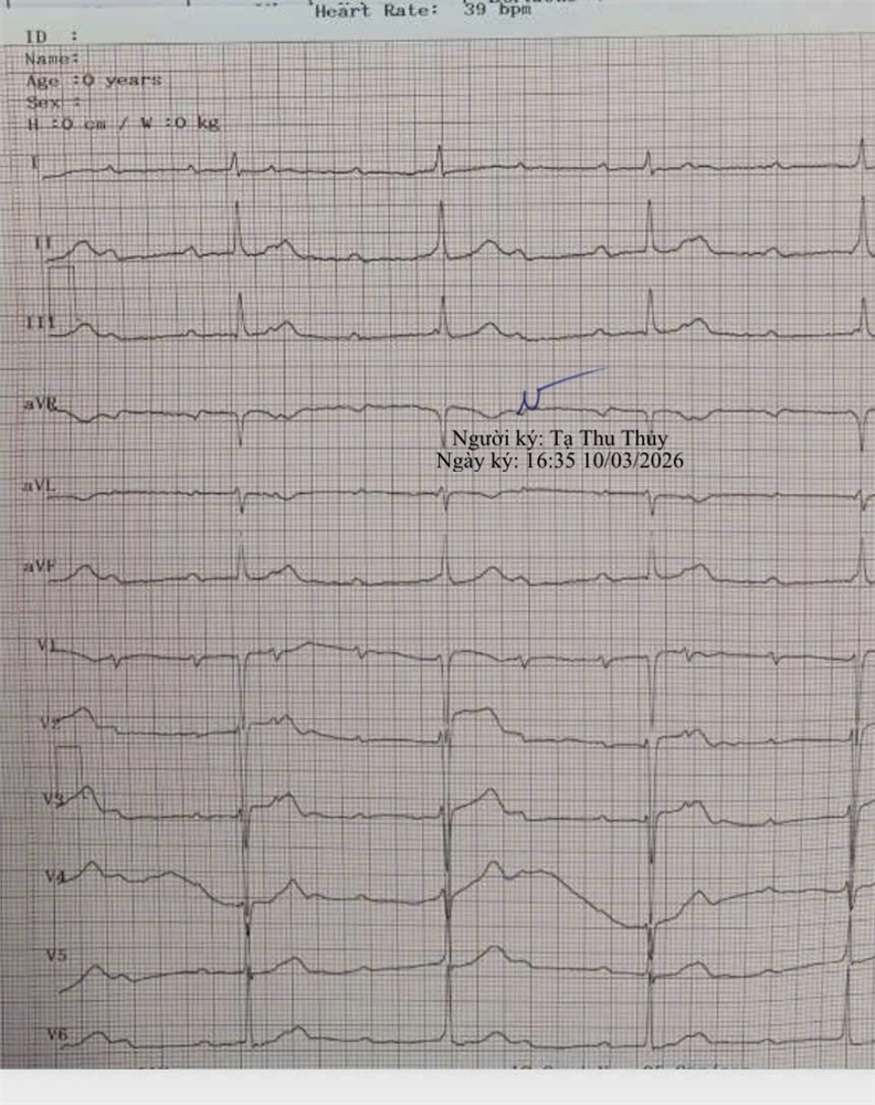 Hình 1: Điện tâm đồ của bệnh nhân khi nhập viện (Block nhĩ thất hoàn toàn)