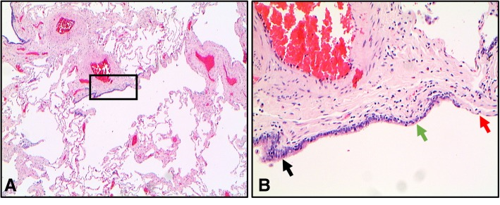 Hình 1. Chuyển tiếp cấu trúc biểu mô trong tiểu phế quản hô hấp. A. Tiểu phế quản thể hiện sự chuyển đổi từ biểu mô trụ sang biểu mô hình khối và cuối cùng là biểu mô phế nang dẹt. B Hình ảnh phóng to từ hình ảnh A cho thấy biểu mô trụ (mũi tên đen), biểu mô hình khối (mũi tên xanh) và biểu mô dẹt (mũi tên đỏ)