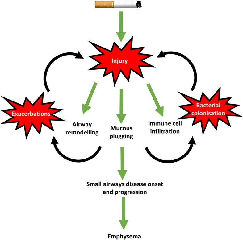 Cơ chế khởi phát và tiến triển của bệnh đường thở nhỏ trong COPD. Hút thuốc lá gây tổn thương các đường thở nhỏ. Các quá trình sửa chữa tổn thương dẫn đến tái cấu trúc đường thở quá mức, nút nhầy và xâm nhập tế bào miễn dịch. Những yếu tố này góp phần vào sự khởi phát và tiến triển của bệnh đường thở nhỏ, có trước khí phế thũng. Những thay đổi này có thể dẫn đến gia tăng đợt cấp COPD và sự xâm nhập của vi khuẩn, do đó, có thể góp phần vào sự tiến triển của bệnh đường thở nhỏ và phát triển khí phế thũng