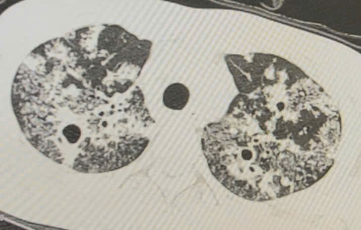 + Đông đặc nhu mô phổi: thường là đông đặc một vài phân thùy tại các vị trí khác nhau, vùng phổi đông đặc thường không đồng nhất, hay đi kèm các đường mờ (xơ).