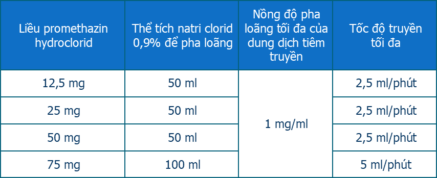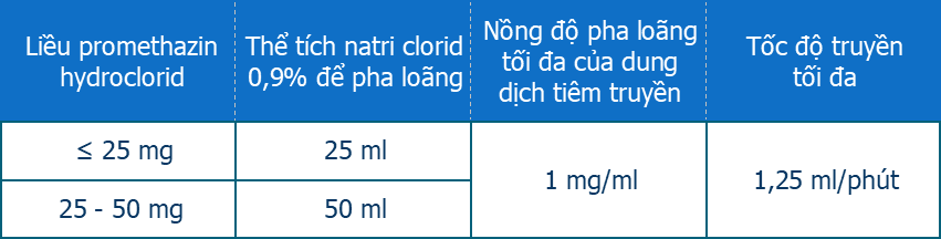 * Khi pha loãng và truyềnpromethazin hydroclorid đường tĩnh mạch, thời gian truyền từ 20 đến 40 phút. Nhân viên y tế cần tham khảo cách pha loãng và truyền cho bệnh nhân người lớn và trẻ em trong Bảng 1 và Bảng 2 dưới đây: