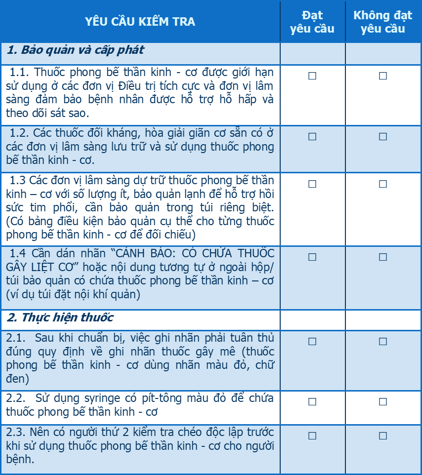Yêu cầu việc dán nhãn chính xác cho tất cả các dịch truyền và syringe có chứa thuốc phong bế thần kinh - cơ ở cả khu vực trong và ngoài phòng mổ (Nếu điều kiện cho phép, nên cung cấp syringe định liều và túi truyền thuốc đã được chuẩn bị sẵn và dán nhãn).