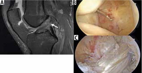Với chấn thương mãn tính, dây chằng chéo trước có thể không có hoặc teo. Sự vắng mặt của các sợi dây chằng chéo trước trong rãnh xương đùi gợi ý đến một vết rách gần (dấu hiệu “rãnh trống”). Gốc dây chằng chéo trước đôi khi có thể để lại sẹo cho các cấu trúc lân cận, mang lại sự ổn định về mặt lâm sàng và ngăn ngừa chẩn đoán vết rách trên cả cộng hưởng từ và khám sức khỏe. Có thể phân biệt được u nang hạch Cruciate và sự thoái hóa chất nhầy của dây chằng chéo trước với rách do sự hiện diện của các sợi nguyên vẹn (Hình 13).