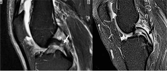 Hình 14. Dây chằng chéo sau: rách một phần và thoái hóa niêm mạc. A là hình ảnh pd xoá mỡ sagital với tín hiệu tăng lên ở phần giữa của dây chằng chéo sau thể hiện vết rách một phần trước đó (mũi tên). B là hình ảnh pd xoã mỡ cho thấy sự xuất hiện "đường ray xe điện" (mũi tên) của dây chằng chéo sau phù hợp với thoái hóa niêm mạc