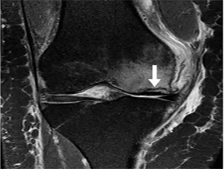 Hình 16. Phù tủy xương và Gãy xương dưới sụn. Hình ảnh pd xóa mỡ coronal với cường độ tín hiệu thấp tuyến tính (mũi tên) bên dưới bề mặt khớp chịu trọng lượng của ống sống giữa xương đùi, phù hợp với gãy xương kèm theo phù tủy xương dưới sụn. -như tín hiệu. Sụn bên dưới còn nguyên vẹn, ngoại trừ thoái hóa sụn chêm ở mức độ trung bình từ trước.