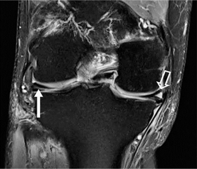 Hình 7. Vết rách ngang sụn. Hình ảnh pd coronal xóa mỡ với tín hiệu tuyến tính trong sụn (mũi tên đóng) kéo dài đến mặt dưới của thân sụn bên, phù hợp với vết rách. Tín hiệu cao (mũi tên mở) ở mặt ngoài, mặt sụn giữa không kéo dài đến bề mặt tạo hình sụn và phù hợp với thoái hóa niêm mạc.