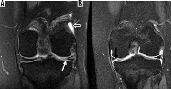 Hình 9. Rách sụn chêm và mô hạt đang lành sau mổ. A là hình ảnh T1 xóa mỡ sau khi tiêm thuốc tương phản trong khớp với tín hiệu tuyến tính sụn chêm bên có giá trị trung gian về cường độ tín hiệu (mũi tên trắng), so với chất tương phản sáng được tiêm vào không gian khớp (mũi tên mở), có thể đại diện cho mô hạt trong sụn chêm bên đã được phẫu thuật sửa chữa trước đó. B là hình ảnh T1 xóa mỡ sau khi tiêm thuốc tương phản nội khớp cho thấy khiếm khuyết cường độ sáng tương phản (mũi tên đen) ở sụn chêm giữa, biểu thị vết rách xuyên tâm.