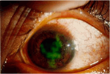 + Trên giác mạc có một ổ loét ranh giới không rõ, đáy ổ loét thường phủ một lớp hoại tử bẩn. Khi nhuộm giác mạc bằng fluorescein 2% ổ loét sẽ bắt màu xanh, nếu ổ loét hoại tử nhiều sẽ có màu vàng xanh.