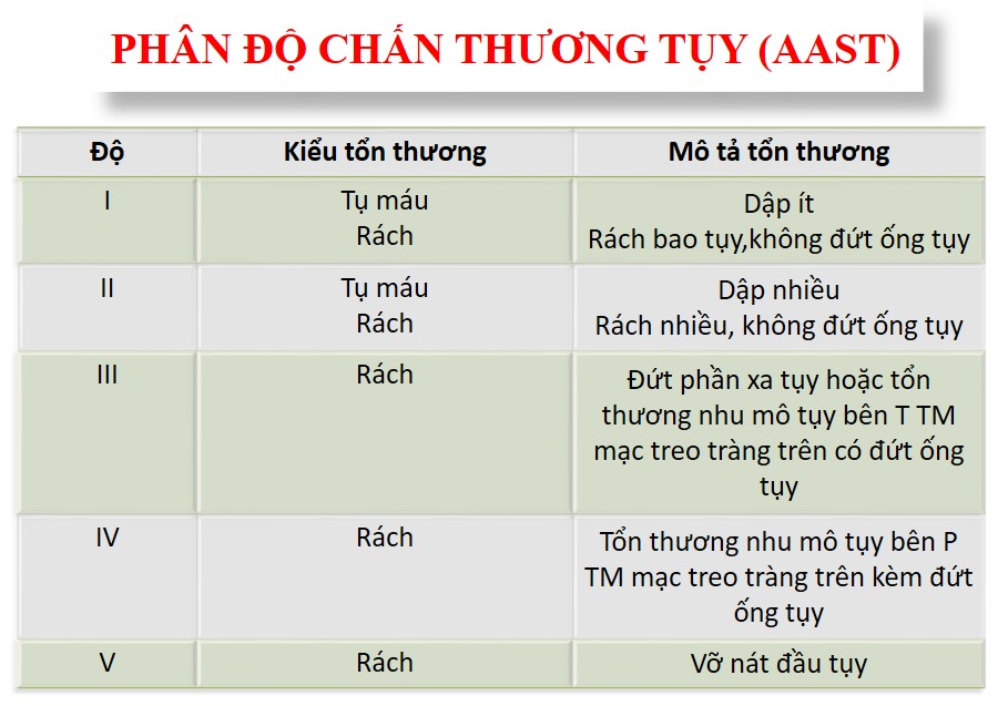 Hiệp hội Phẫu thuật Chấn thương Hoa Kỳ (AAST) đã đề xuất Thang đo Chấn thương Cơ quan tụy (OIS) được chấp nhận phổ biến trong việc phân loại chấn thương tuyến tụy. OIS tụy AAST sử dụng kết quả CT và được áp dụng để hướng dẫn điều trị ở những bệnh nhân huyết động ổn định bị tổn thương tụy kín.