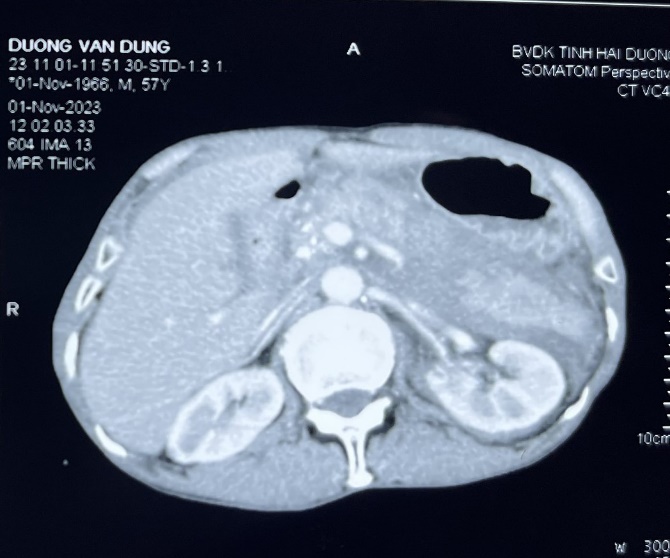 BN nam 57 tuổi có tiền sử lao phổi đang điều trị tháng thứ 5. BN đi xe máy bị Barry-er đập ngang ngực bụng 1 ngày trước khi vào viện. Sau tai nạn BN đau nhiều vùng thượng vị, kèm nôn, bụng chướng tăng dần. Bí trung đại tiện.