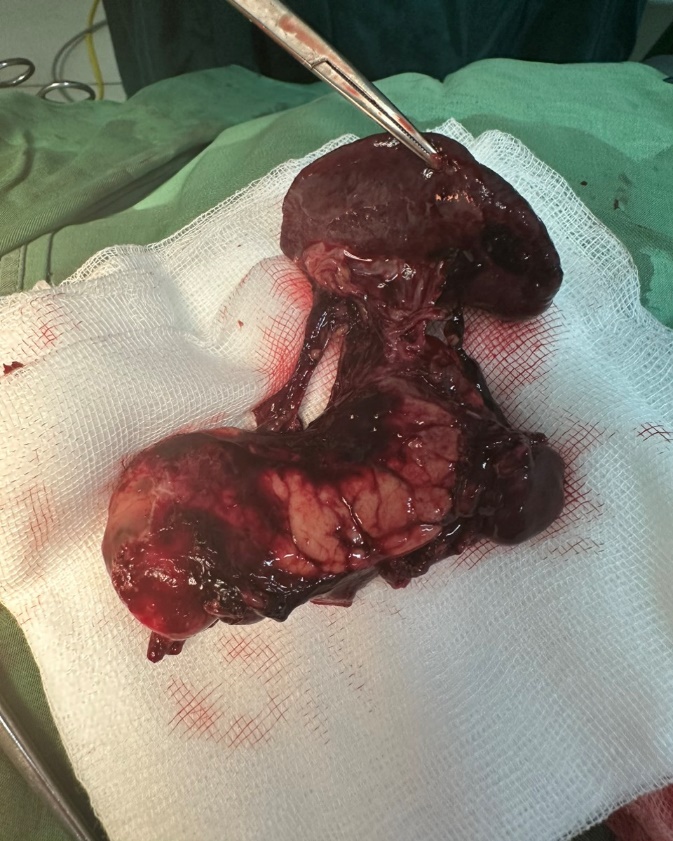 BN được mở bụng đường trắng giữa trên rốn vòng qua rốn. Kiểm tra ổ bụng có dịch máu đỏ tươi. Khối máu tụ lớn trong hậu cung mạc nối. Vào hậu cung mạc nối hút máu cục kiểm tra thấy tụy đứt rời phần thân. Tổn thương bó mạch lách máu phun thành tia. Trận trái to nhẹ không có tụ máu quanh thận. Gan lách, dạ dày đại tràng không thấy có tổn thương. BN được quyết định cắt thân đuôi tụy kèm cắt lách. Khâu kín lại đầu gần của tụy bằng chỉ Vicryl 3.0. BN được rửa lau bụng sạch và đặt dẫn lưu hố lách và Douglas. BN tỉnh ngay sau mổ, trung tiện ngày thứ 2 và hiện tại ngày thứ 3 sau mổ BN đã tỉnh táo ăn uống bình thường, vết mổ khô. Dẫn lưu ra ít dịch hồng.