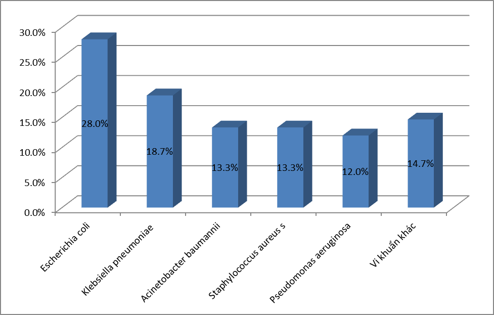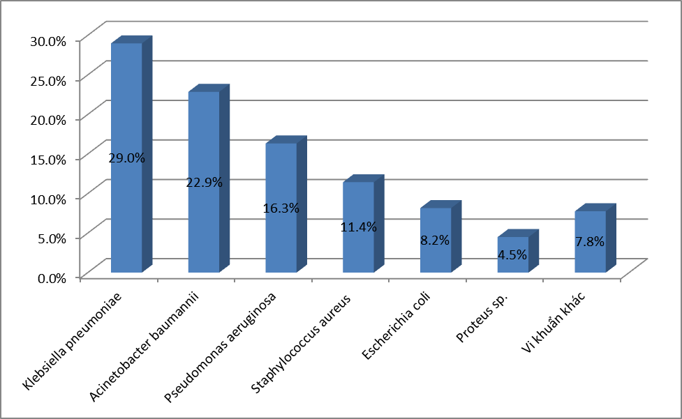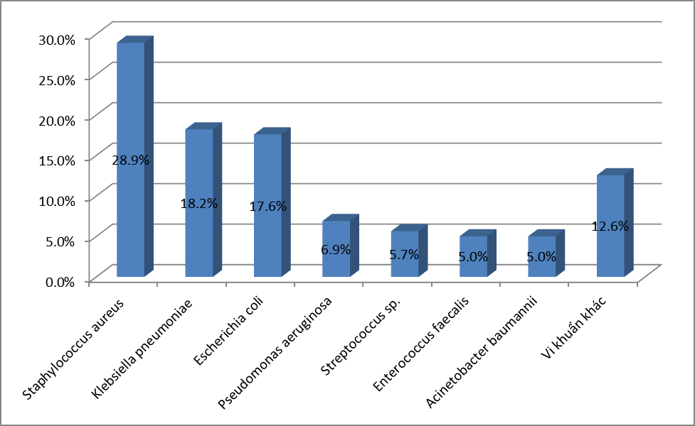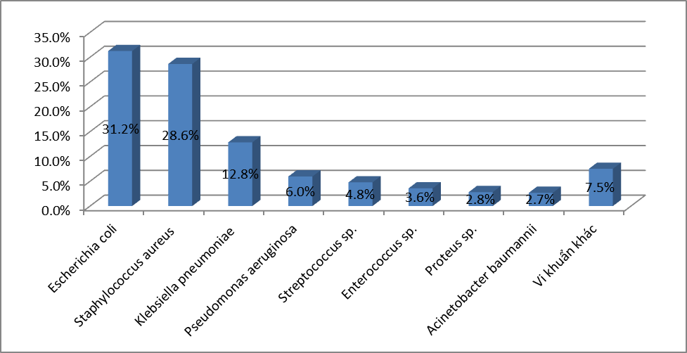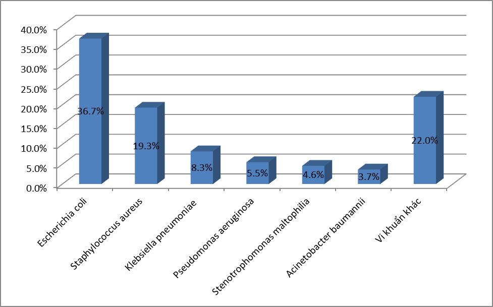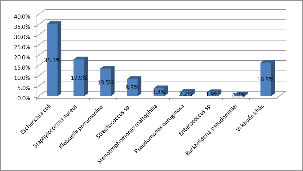 - Căn nguyên hay gặp nhất là E.coli với 26,7%, tiếp đến là K.pneumoniae với 19,3%; S.aureus chiếm tỷ lệ 17,6%;. P.aeruginosa chiếm 8,8%; A.baumannii chiếm tỷ lệ 6,4%; Các loại Streptococcus spp chiếm 4,5% ;Enterococci chiếm tỷ lệ 3,4%. và Proteus là 2,3%; Vk kỵ khí chiếm tỷ lệ thấp với 0,1%. Các VK còn lại chiếm tỷ lệ rất thấp.