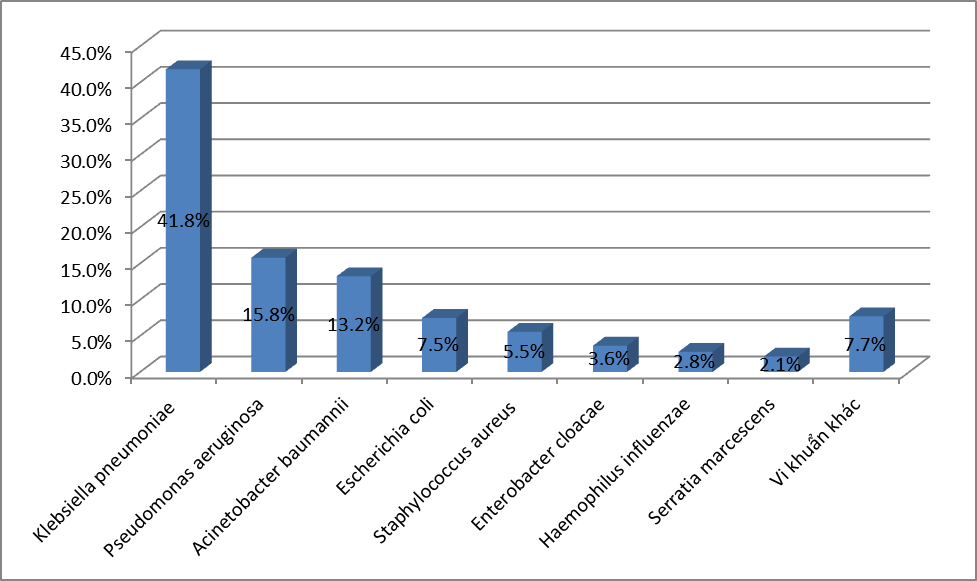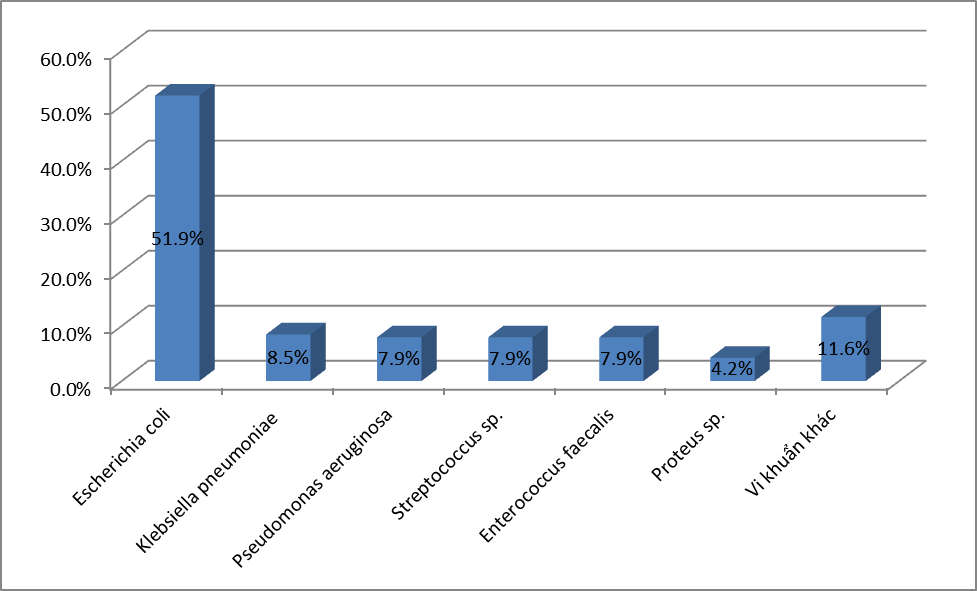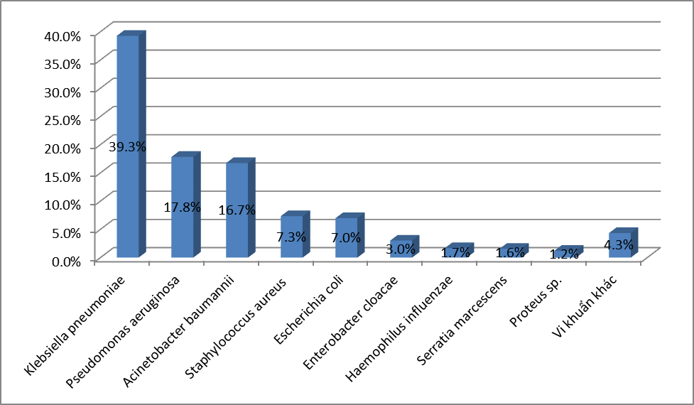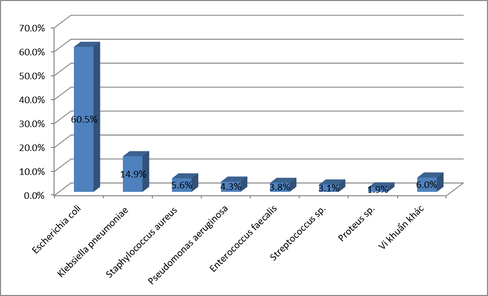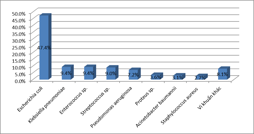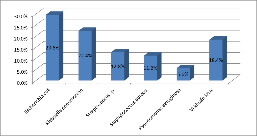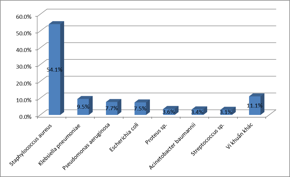 - Căn nguyên hay gặp nhất là E.coli với 26,7%, tiếp đến là K.pneumoniae với 19,3%; S.aureus chiếm tỷ lệ 17,6%;. P.aeruginosa chiếm 8,8%; A.baumannii chiếm tỷ lệ 6,4%; Các loại Streptococcus spp chiếm 4,5% ;Enterococci chiếm tỷ lệ 3,4%. và Proteus là 2,3%; Vk kỵ khí chiếm tỷ lệ thấp với 0,1%. Các VK còn lại chiếm tỷ lệ rất thấp.