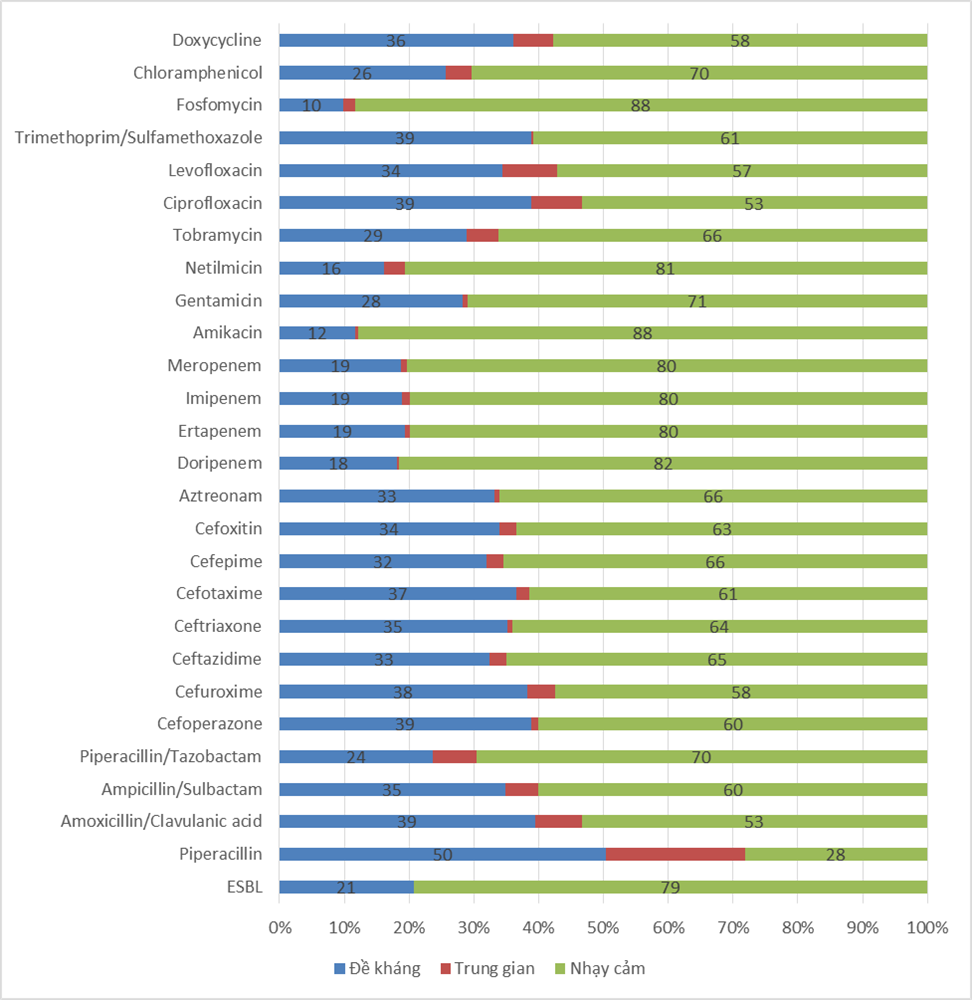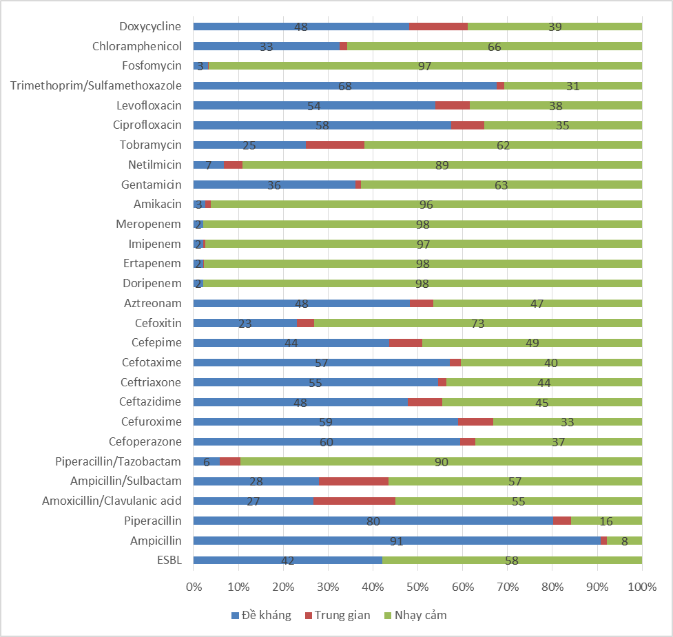 - Tỷ lệ sinh ESBL ở E. coli là 42% (346/824 chủng phân lập được).