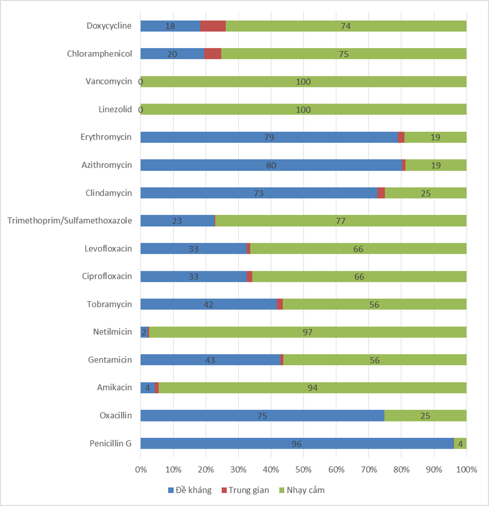 - S. aureus nhạy cảm với 100% vancomycin, linezolid ; 97% netilmicine, 94% amikacin, 77% co-trimoxazol , 75% chloramphenicol và 74% doxycyclin.