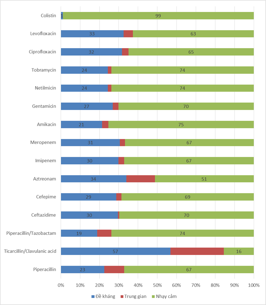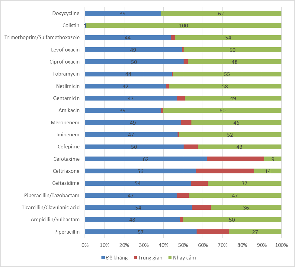 Nhận xét: Vi khuẩn đã đề kháng với hầu hết các nhóm kháng sinh với tỷ lệ rất cao > 50%; nhạy cảm với 62% doxycycline, 60% amikacin, 58% netilmicin và 54% co-trimoxazol. Riêng đối với Colistin, VK nhạy cảm hoàn toàn với tỷ lệ 100%.