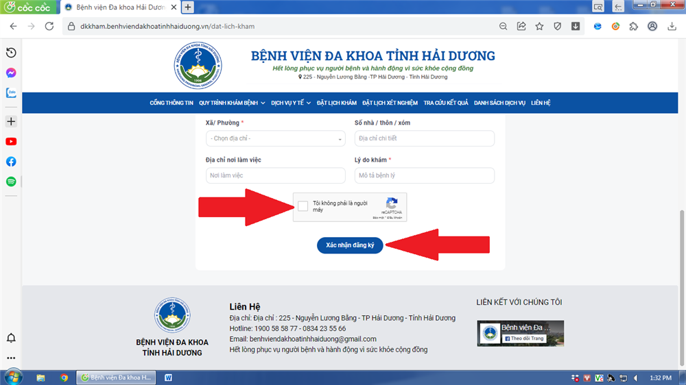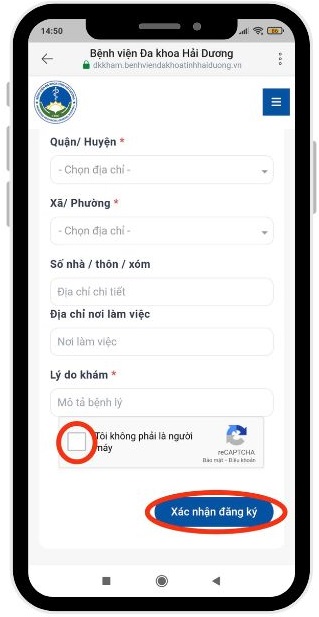 - Trên bảng Thông tin khám chữa bệnh, người dân điền đầy đủ thông tin theo các mục và tích chọn “ Tôi không phải người máy” và bấm “Xác nhận đăng ký”.