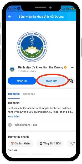 * CÁCH 3: Đăng ký qua Tài khoản Zalo OA Bệnh viện Đa khoa tỉnh Hải Dương.