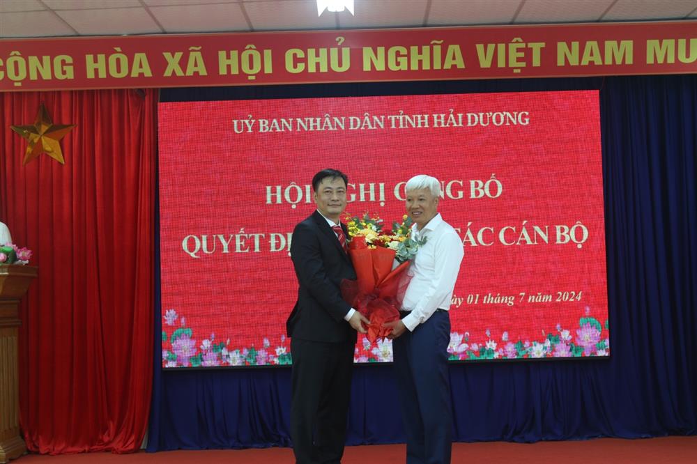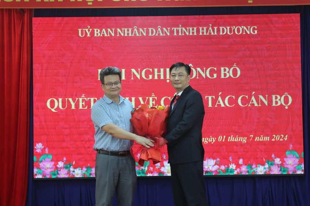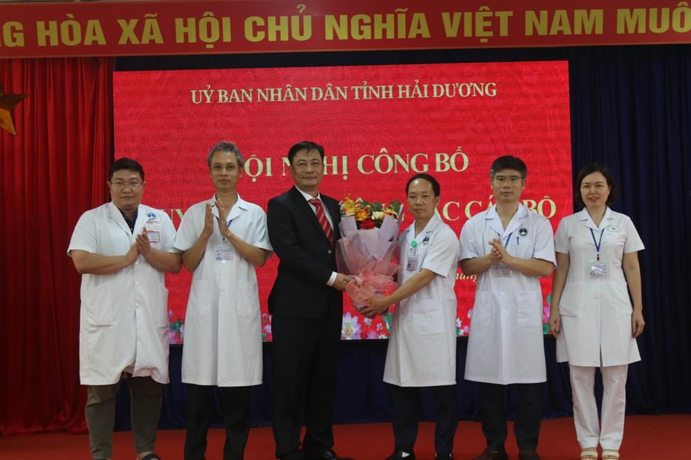Tiến sĩ, Bác sĩ Vũ Minh Hiệp (bên trái) nhận Quyết định bổ nhiệm chức vụ Giám đốc Bệnh viện Đa khoa tỉnh Hải Dương