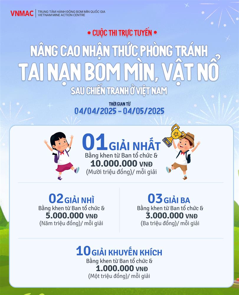 Kết quả Cuộc thi sẽ được đăng tải trên Trang thông tin điện tử Trung tâm Hành động bom mìn quốc gia Việt Nam tại địa chỉ http://vnmac.gov.vn và Fanpage: https://www.facebook.com/vnmac.gov.vn.