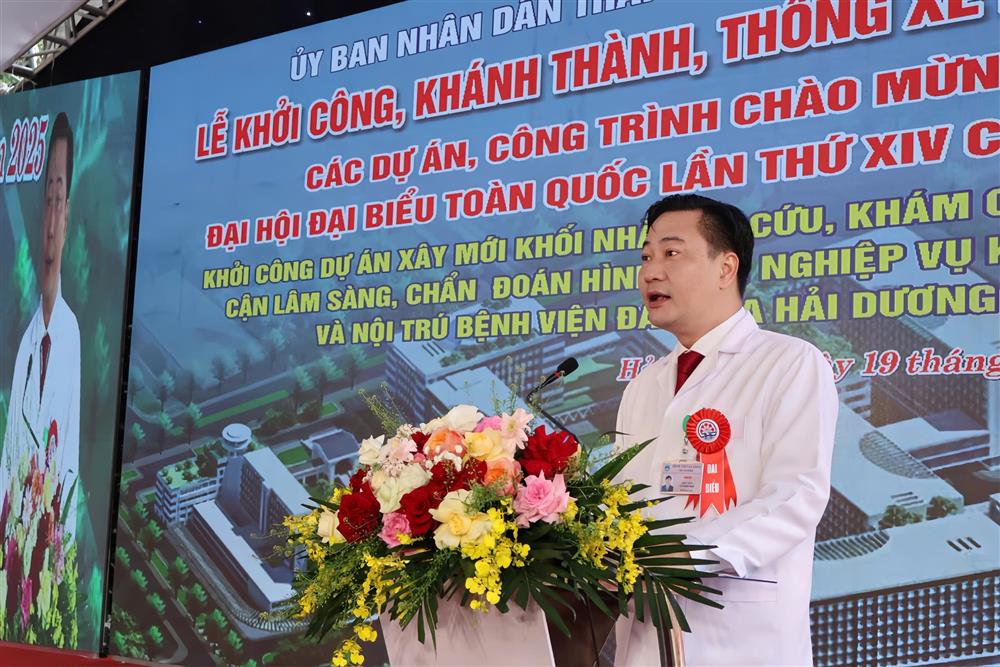 Phát biểu tại buổi lễ, TS.BS Vũ Minh Hiệp – Bí thư Đảng ủy, Giám đốc Bệnh viện Đa khoa Hải Dương nhấn mạnh: Trong không khí toàn thành phố Hải Phòng đồng loạt khởi công, khánh thành nhiều công trình lớn mang tầm chiến lược, việc Bệnh viện Đa khoa Hải Dương được triển khai dự án xây dựng mới các khối nhà chức năng là niềm vinh dự to lớn, đồng thời là nhiệm vụ chính trị quan trọng, có ý nghĩa lâu dài và bền vững. Dự án góp phần cụ thể hóa Nghị quyết số 72-NQ/TW ngày 9/9/2025 của Bộ Chính trị về các giải pháp đột phá tăng cường chăm sóc, bảo vệ và nâng cao sức khỏe nhân dân, cũng như Nghị quyết Đại hội Đảng bộ thành phố Hải Phòng, hướng tới mục tiêu xây dựng thành phố trở thành trung tâm chăm sóc sức khỏe toàn dân toàn diện.