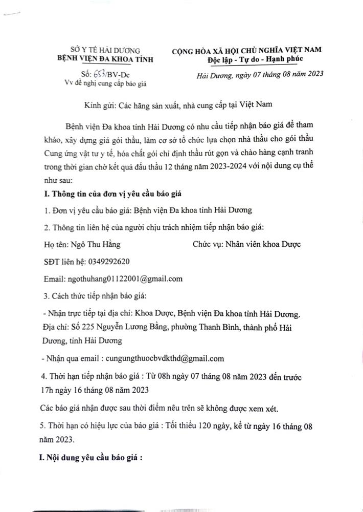Bệnh viện Đa khoa tỉnh Hải Dương có nhu cầu tiếp nhận báo giá để tham khảo, xây dựng giá gói thầu, làm cơ sở tổ chức nhà thầu cho gói thầu Cung ứng vật tư y tế, hóa chất gói chỉ định thầu rút gọn và chào hàng cạnh tranh trong thời gian chờ kết quả đấu thầu 12 tháng năm 2023-2024.