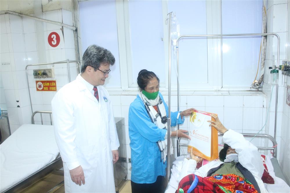 Ngay sau buổi làm việc, Đoàn công tác đã đến thăm hỏi và tặng 80 suất quà hỗ trợ ( mỗi suất bao gồm 1 triệu đồng tiền mặt và quà) cho các bệnh nhân ung thư có hoàn cảnh khó khăn đang điều trị tại Trung tâm Ung bướu của Bệnh viện, tổng giá trị các suất quà là hơn 80 triệu đồng.