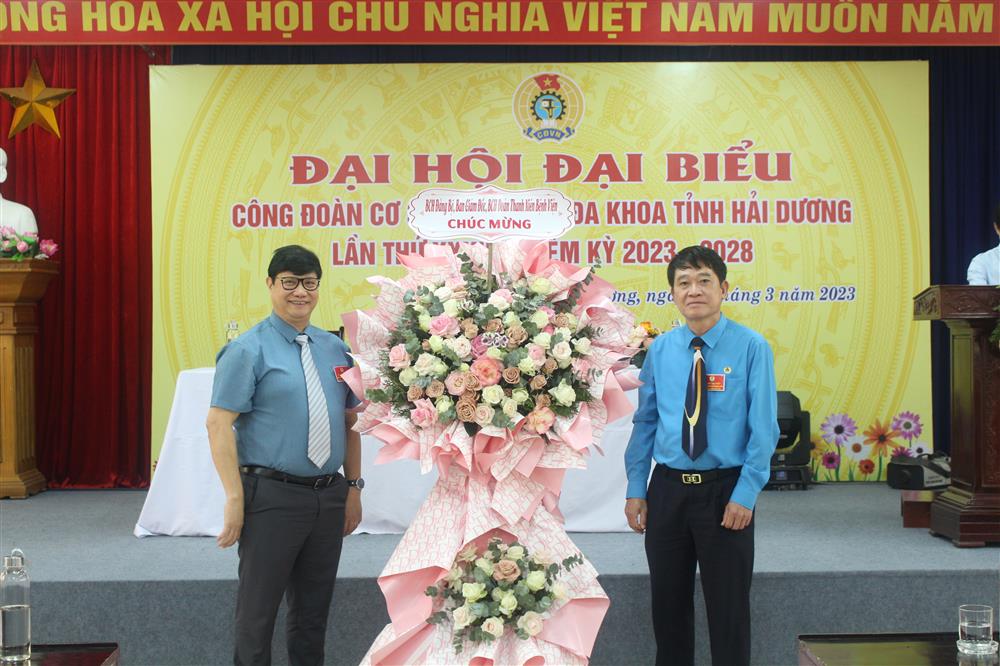 Đồng chí Trần Quang Cảnh – Giám đốc sở Y tế Hải Dương và đồng chí Nguyễn Thị Bình – Chủ tịch Công đoàn Ngành Y tế tỉnh Hải Dương tặng hoa chúc mừng Đại hội.