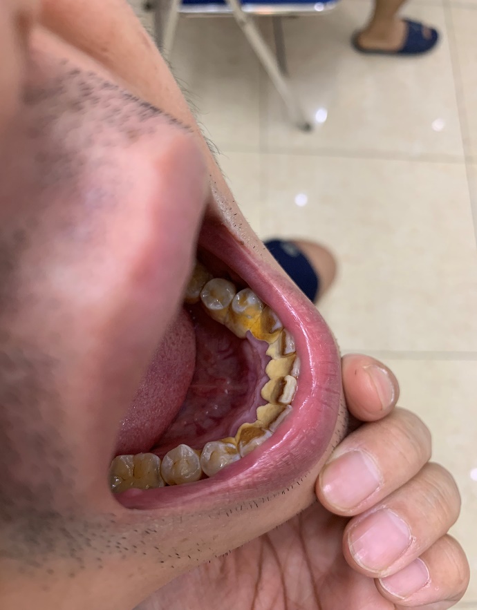 Hình ảnh: Bệnh nhân bị viêm nha chu,tụt lợi,lộ chân răng xô lệch.lung lay răng