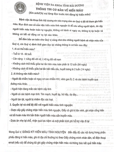 Mẫu đăng kí hiến máu tại Bệnh viện Đa khoa tỉnh Hải Dương