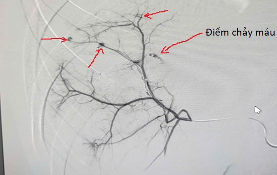 Hình ảnh sau khi chụp mạch máu của bệnh nhân (Với những điểm chảy máu được vẽ mũi tên đỏ)